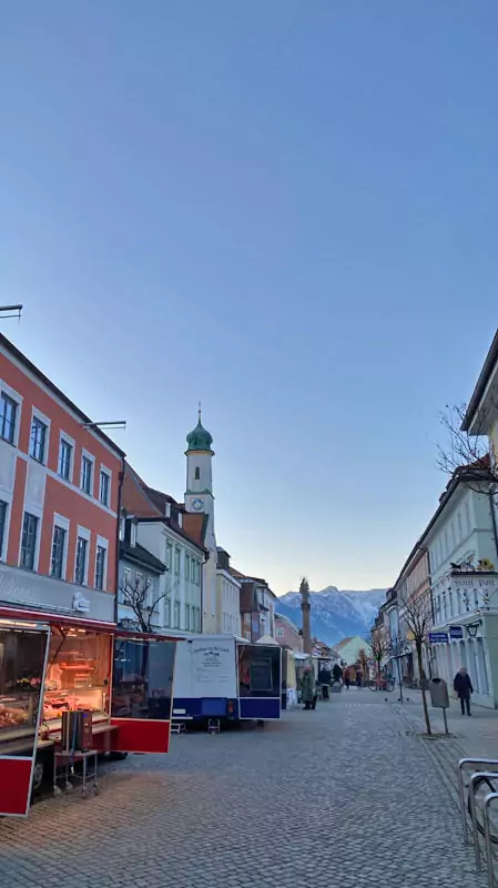 Auch die anderen Lebensmittelhändler in der Murnauer Fußgängerzone kannst du bei deinem Marktbesuch besuchen. Zum Start des Wochenmarkts um 7 Uhr gibt es schon frisch gebackenes Brot beim Backhaus Tichelkamp oder Meister und Erl und weitere Lebensmittel beim Feinkost Pöltl oder der Metzgerei Haller.